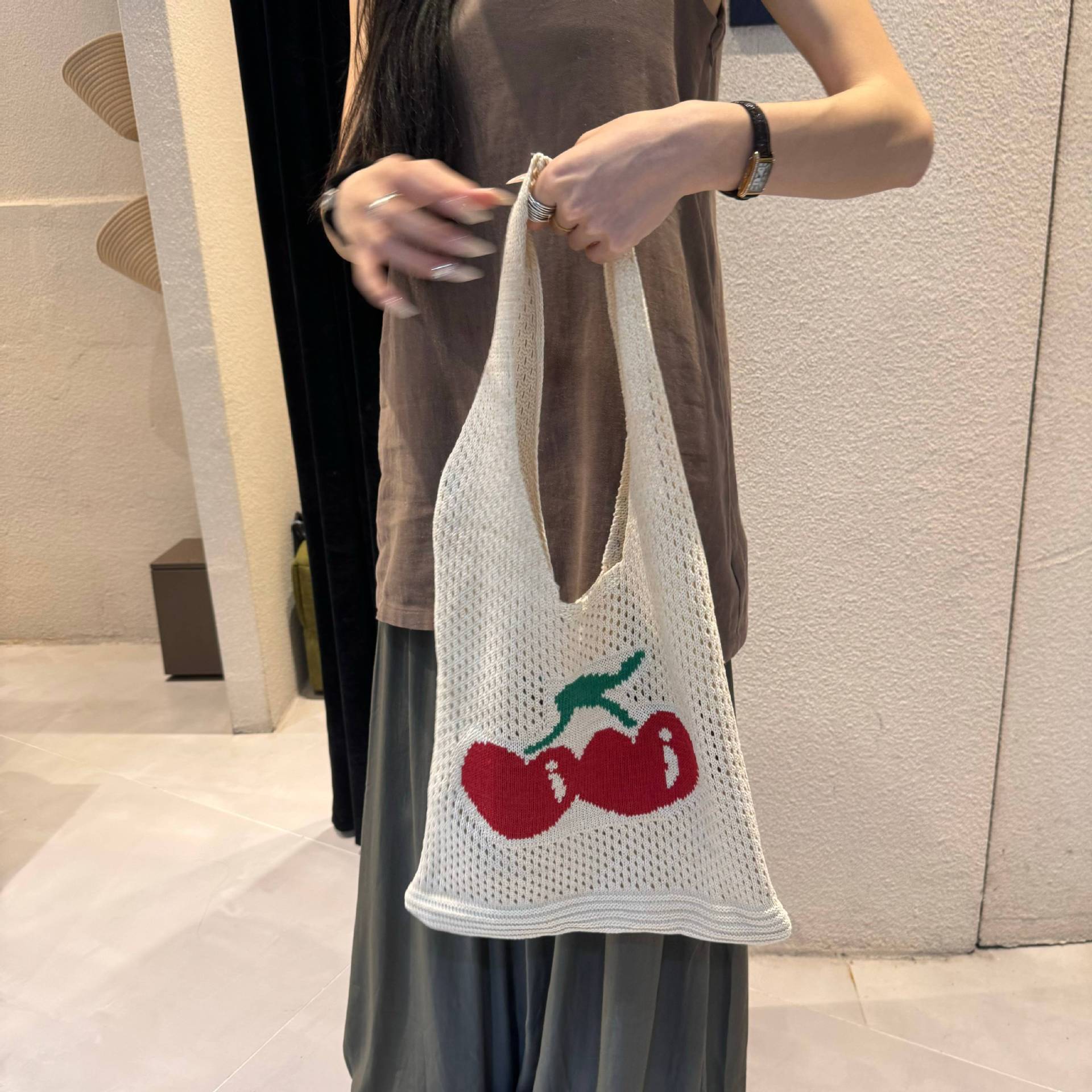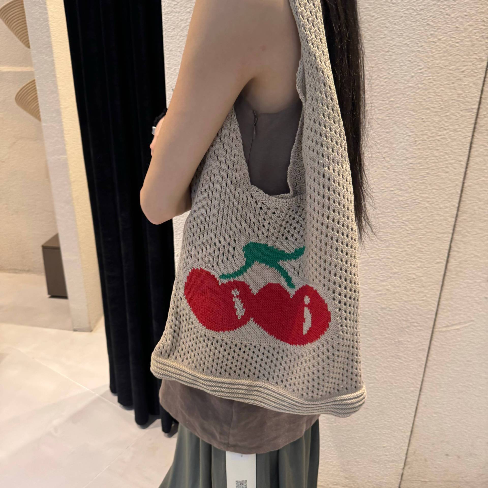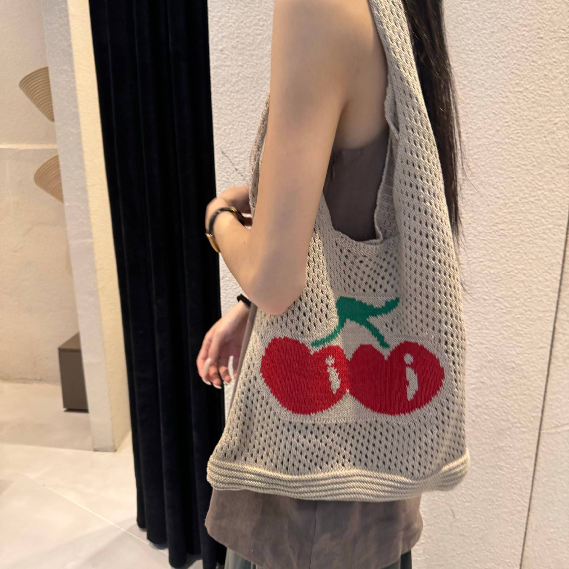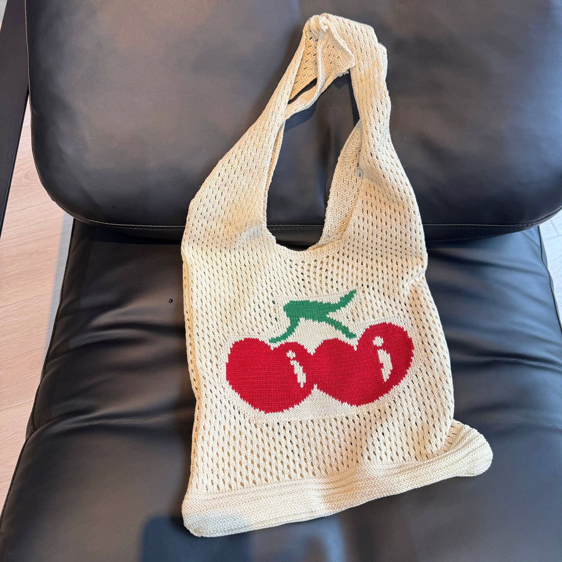 Large Capacity Totes Cherry Embroidered Handbag Knitted Hollow