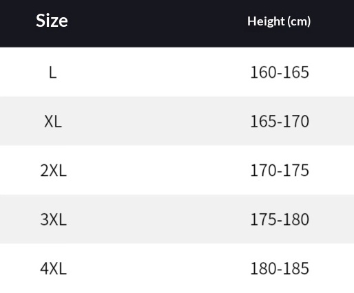 Size: L 100-130lbs, XL 130-160lbs, 2XL 160-190lbs, 3XL 190-225lbs, 4XL 225-260lbs