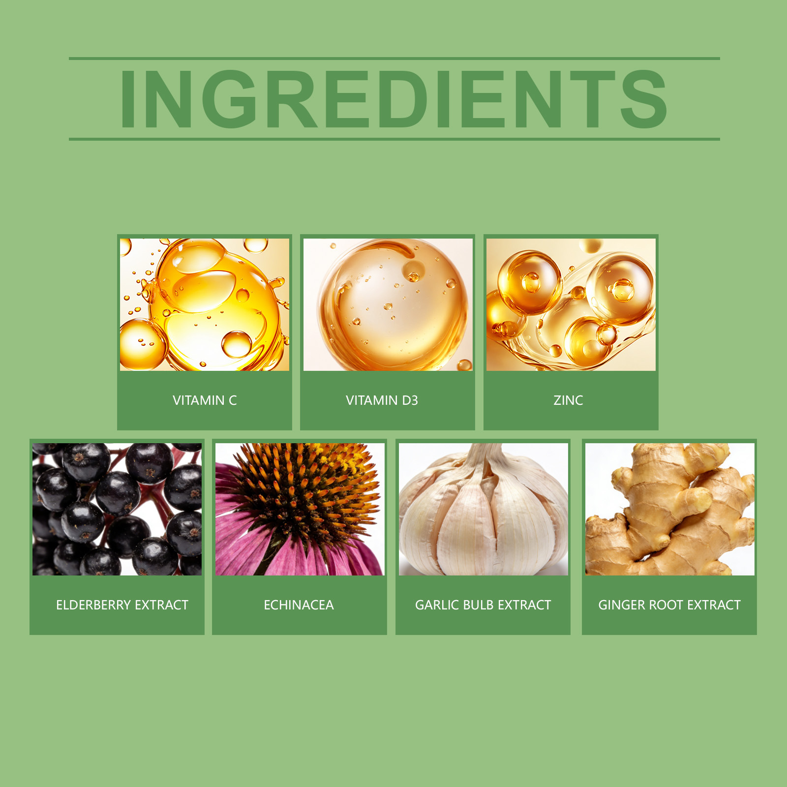 Ingredients: vitamin C, vitamin D3, zinc, elderberry extract, Echinacea purpurea, garlic bulb extract, ginger root extract.