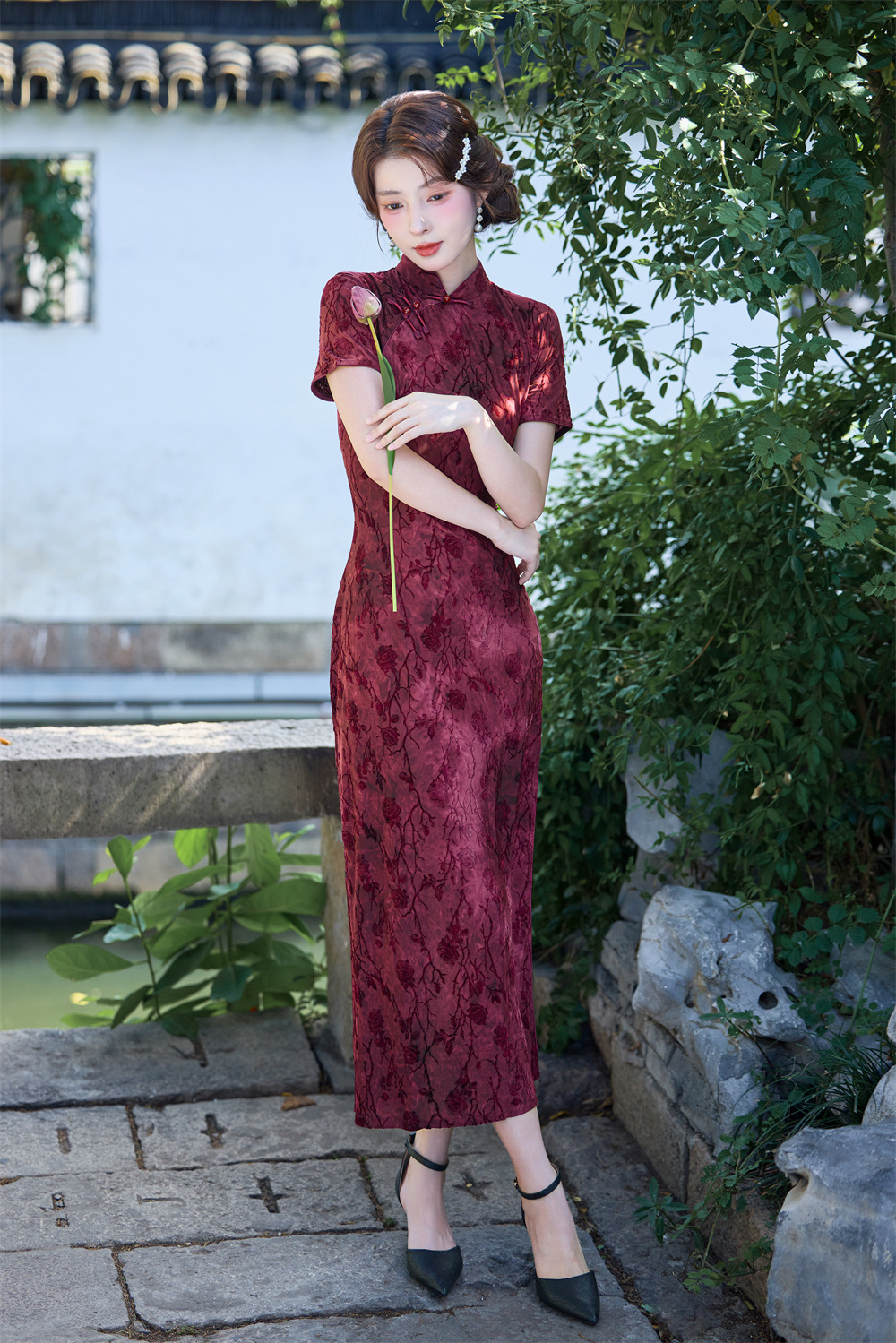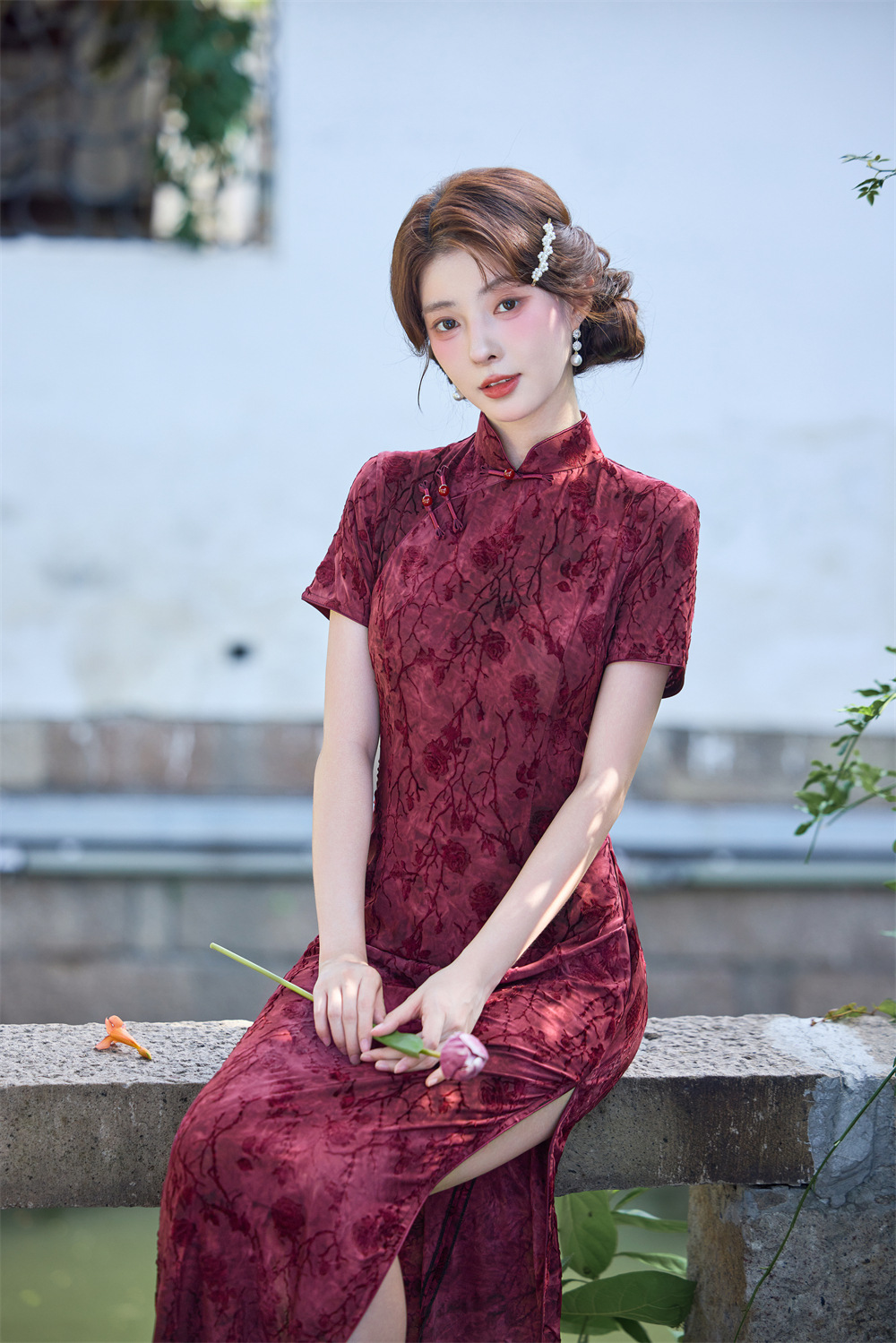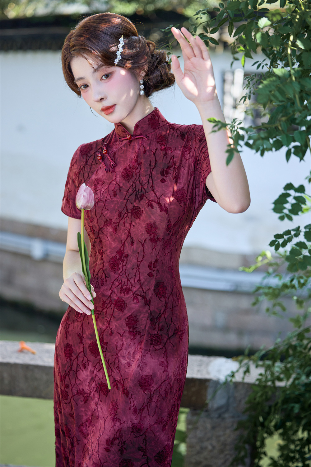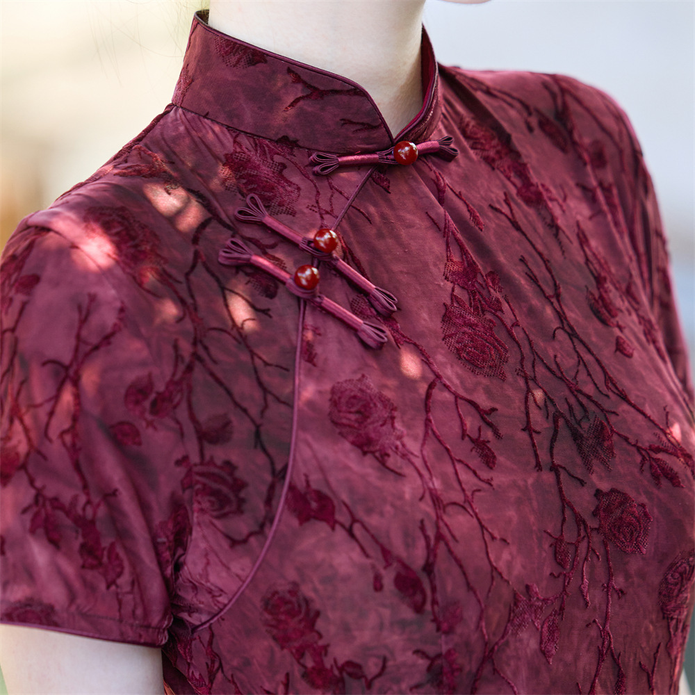 Wearable Flocking Red Small Flower Mid-length Cheongsam Women's Short Sleeve Retro