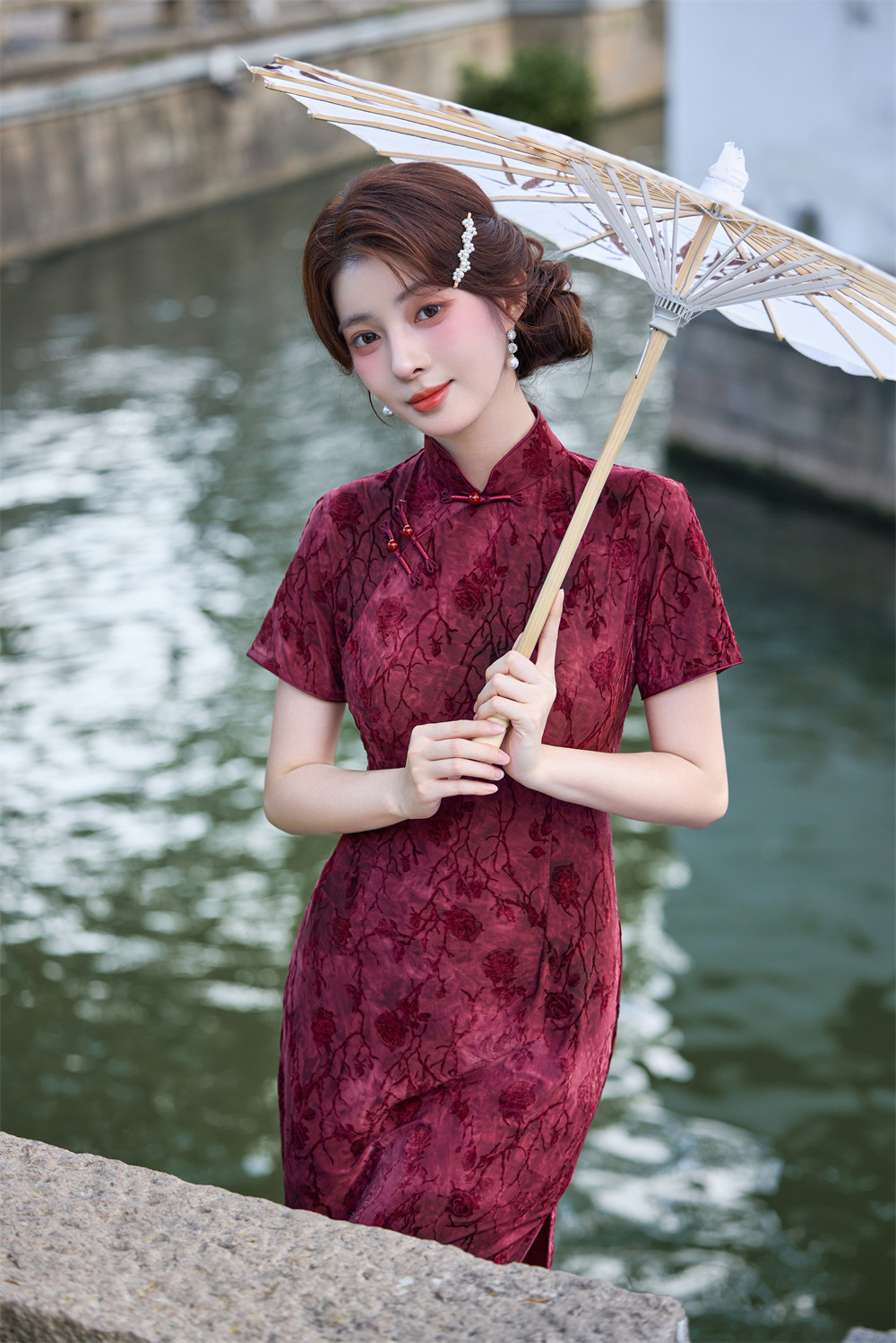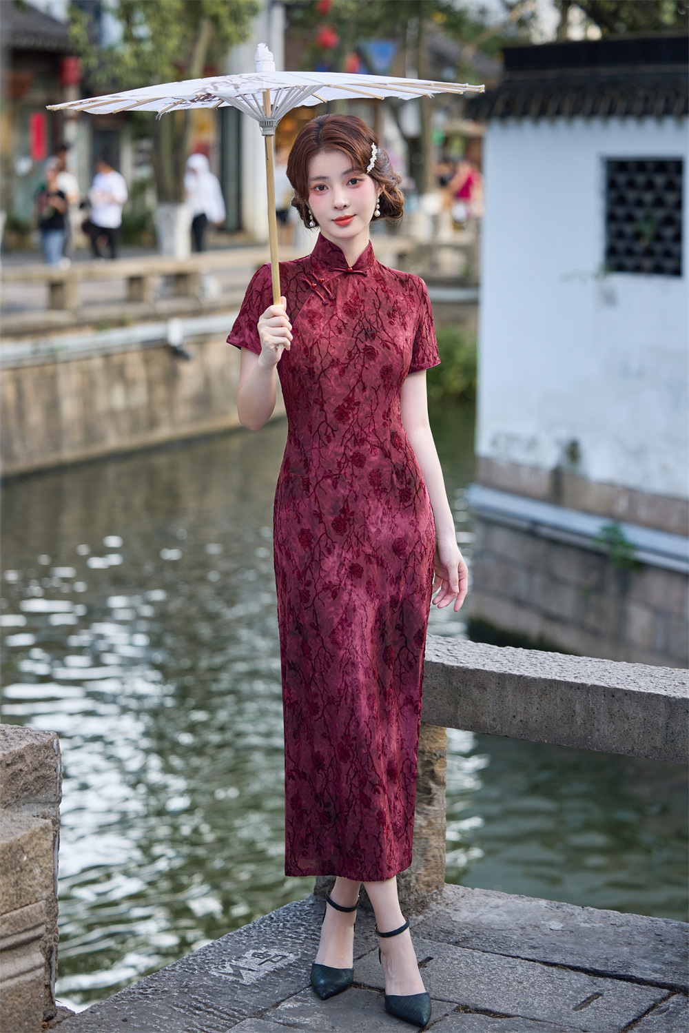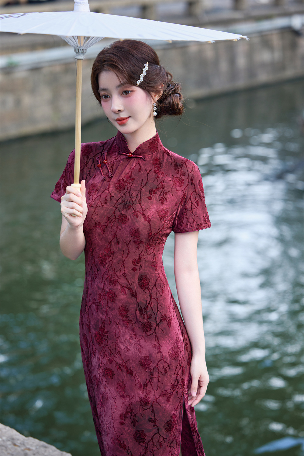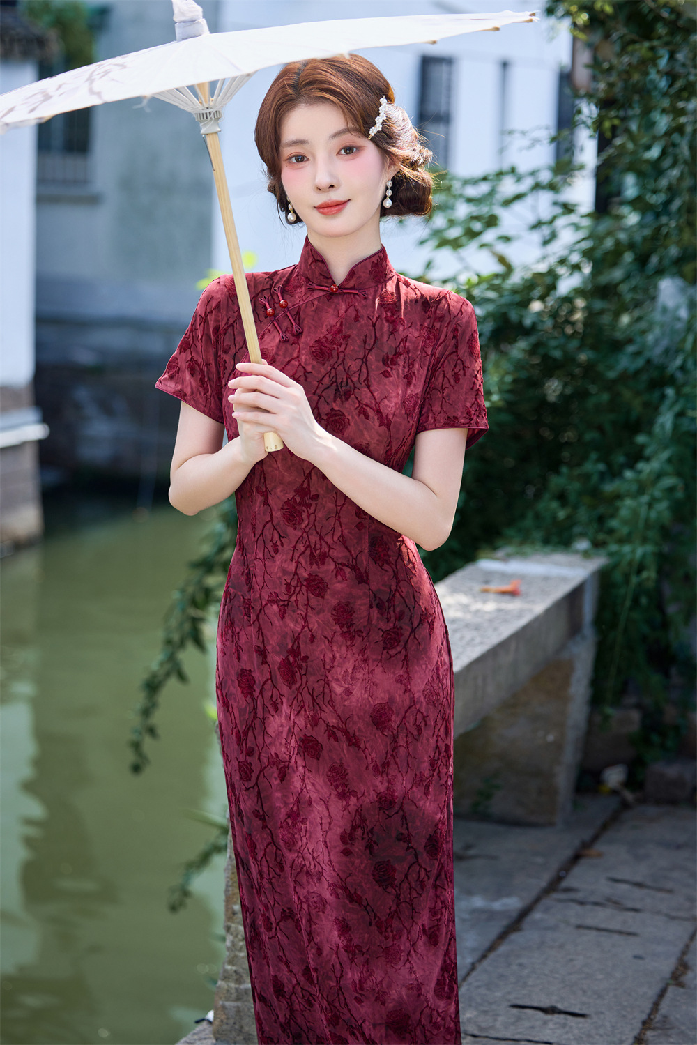 Wearable Flocking Red Small Flower Mid-length Cheongsam Women's Short Sleeve Retro