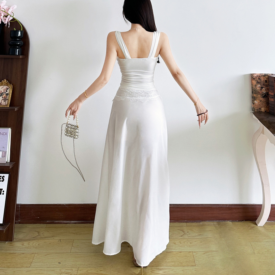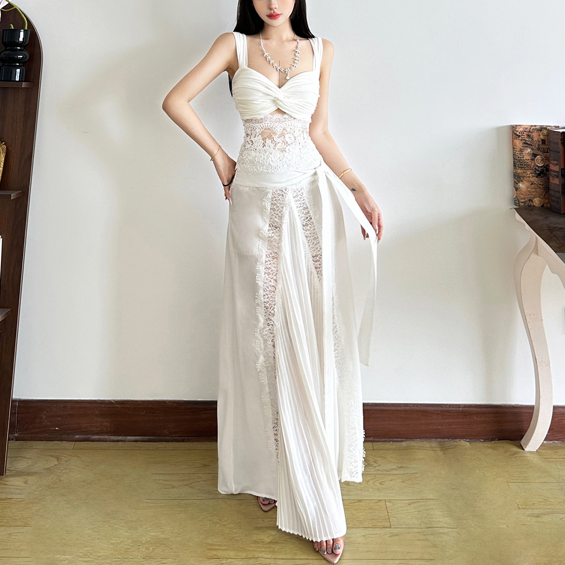 Color: White top, white skirt