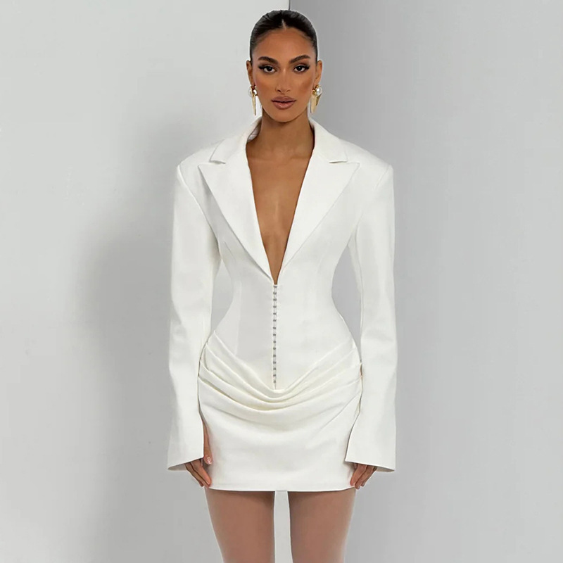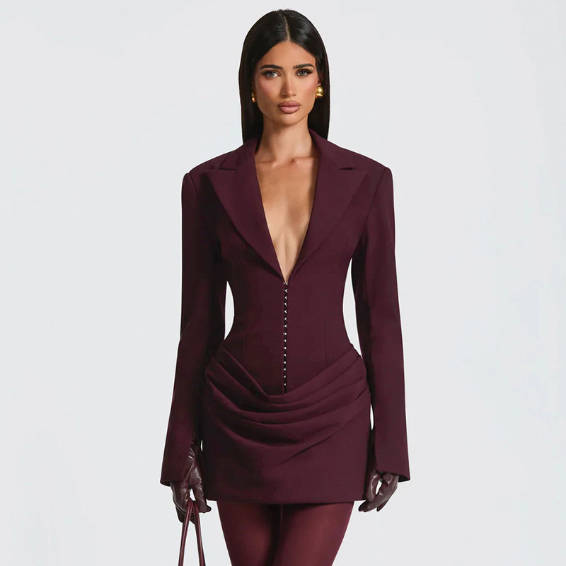 Women's Solid Color Deep V Lapel Pleated Waist-tie Suit Dress