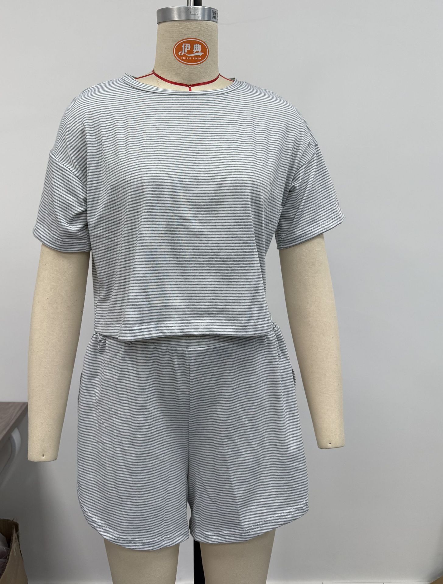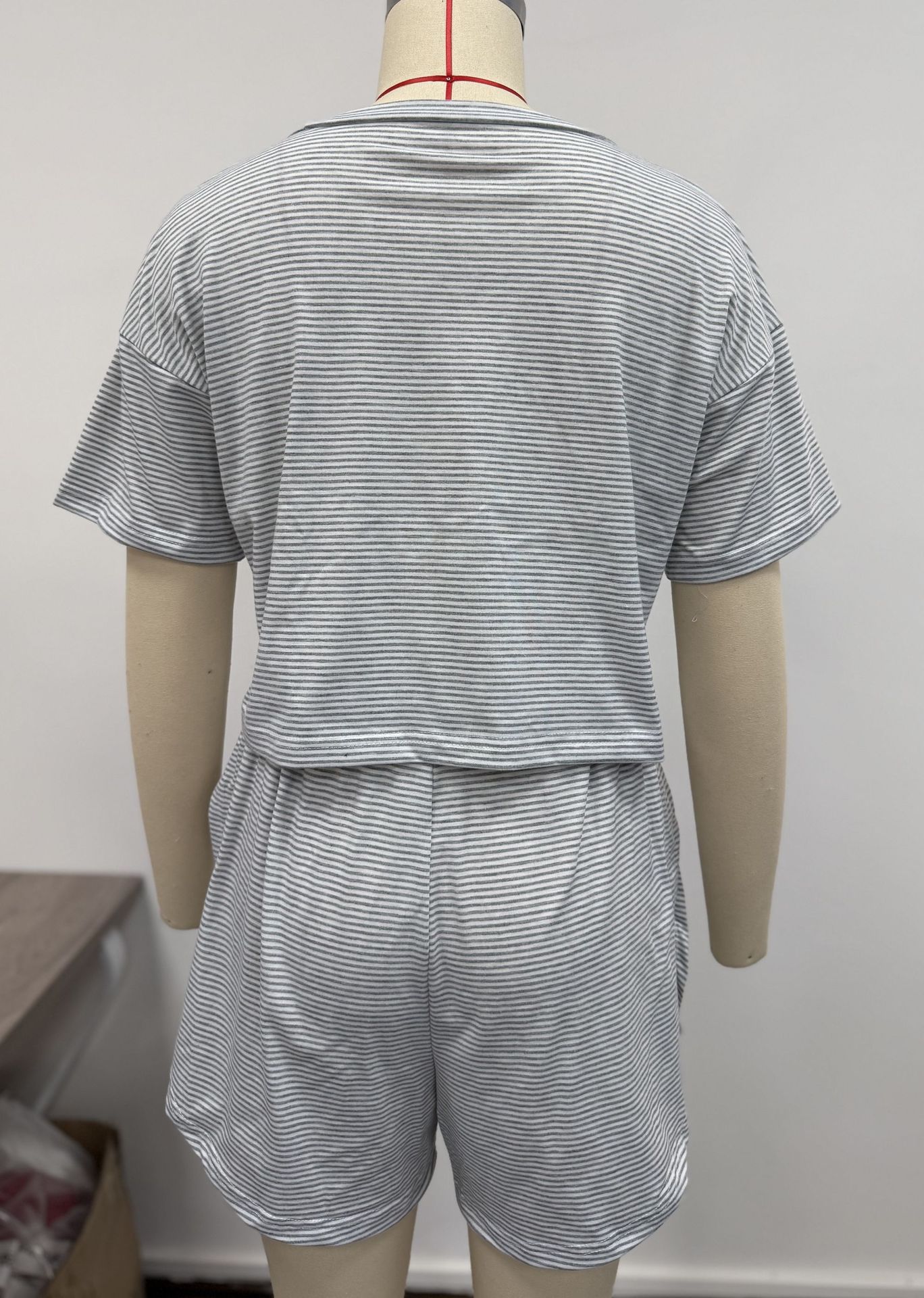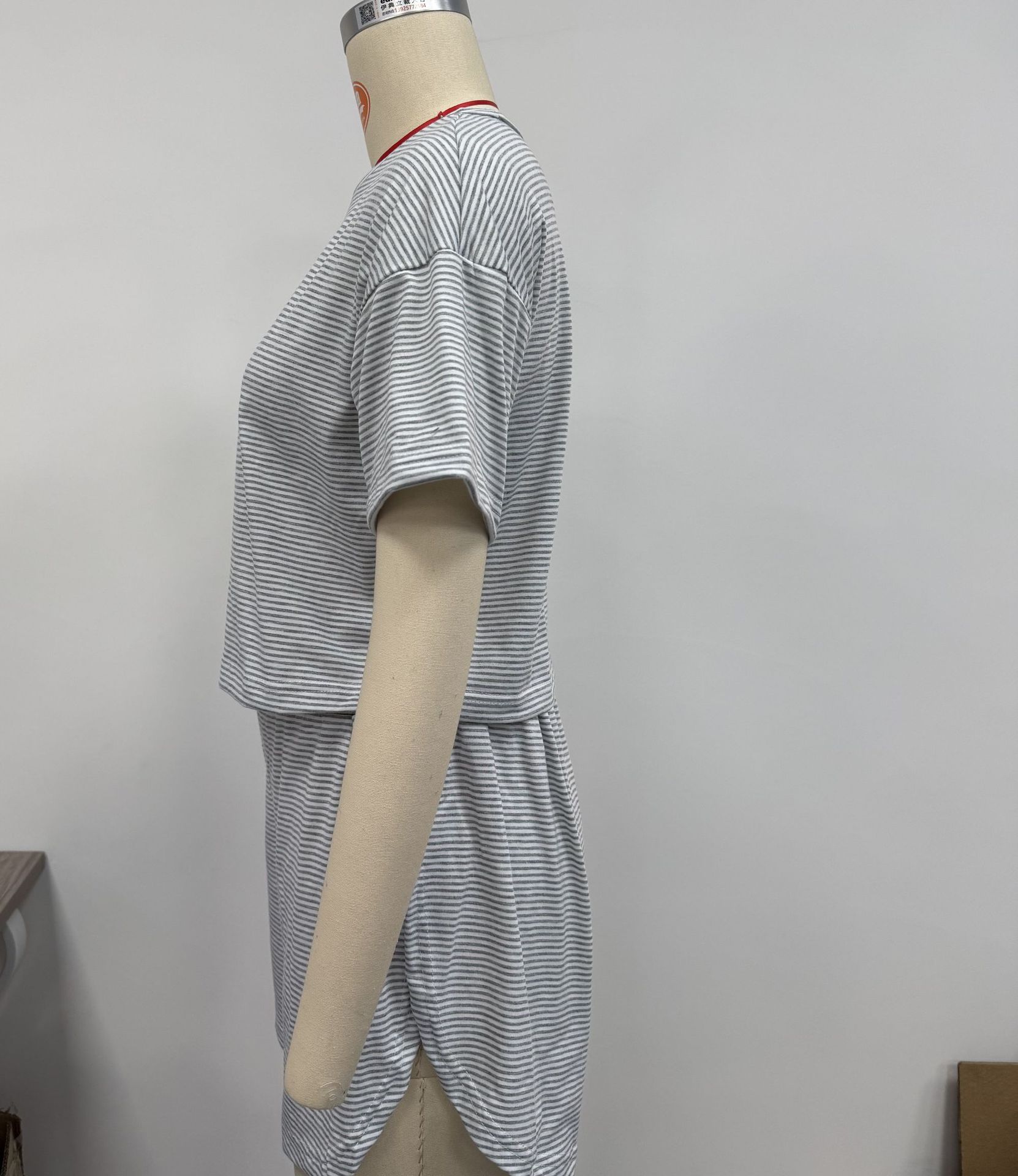 Women's Striped Casual Short-sleeved Top With Side Slit Shorts Set